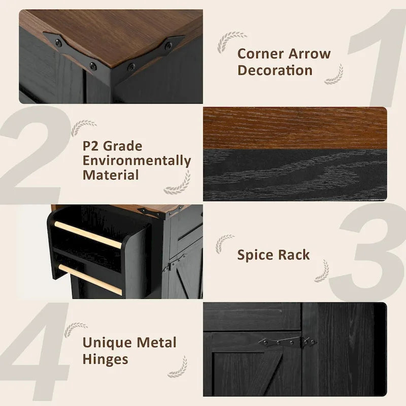 This Large kitchen island measures 53.5W x 28.75D x 36.5 H. Its black wood grain cabinet and brown wood grain tabletop lend a touch of farmhouse charm. The four doors open up to reveal adjustable shelves, allowing you to customize the interior storage according to your needs. Additionally, the two drawers provide extra space for storing smaller items such as napkins, coasters, or even your favorite wine accessories.
