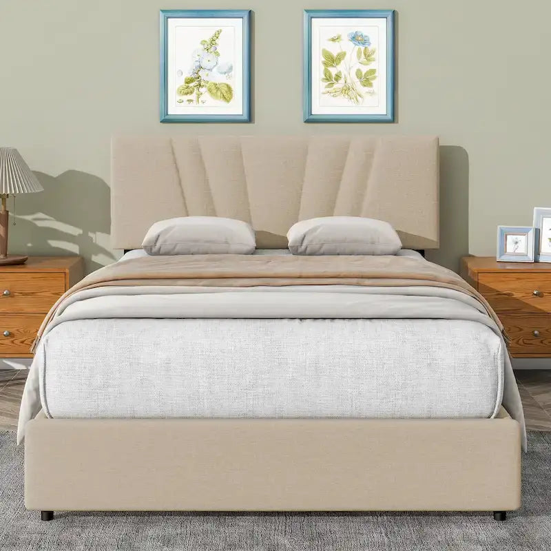 Beige Full Upholstered Platform Bed with Hydraulic Lift Storage and Tufted Headboard - Ideal for All Ages