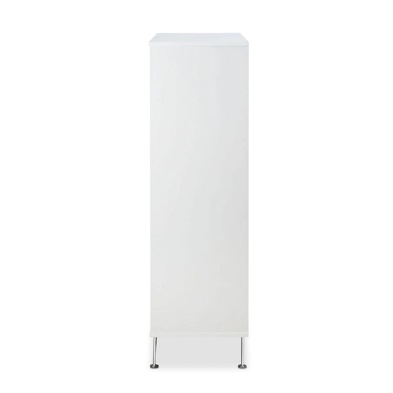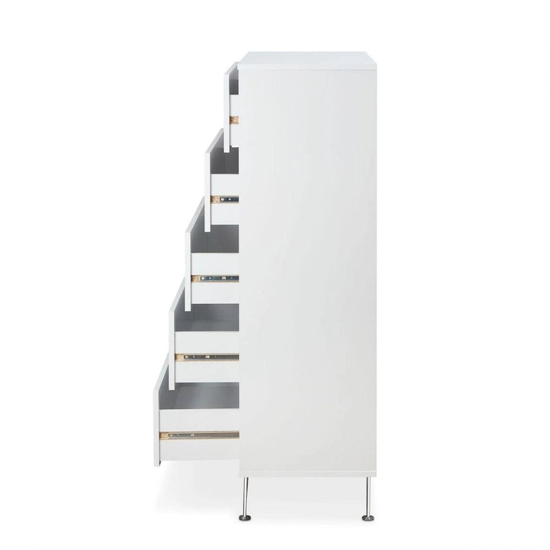 This beautiful Deoss chest of drawers boasts of contemporary style, five drawers with metal drawer handles. Crafted with rich white finish enhances this dresser's sleek style and the drawers provide plenty of storage space for clothes and more.