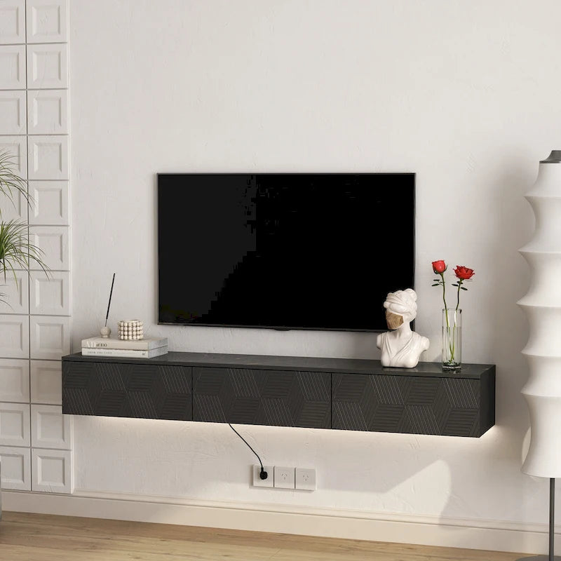 - This wall mounted TV stand has a large storage space, perfect for storing TV components, game accessories, books and decorations. You can also place living room decorations on the TV stand.