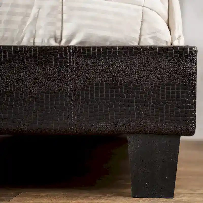Slick modern style with a low-profile aesthetic and build brings attitude to a contemporary master or guest bedroom, focusing on a minimalism that works in today's trending designs. The Gols modern brown faux leather platform bed offers an opportunity to embellish custom linens and dcor while offering its own striking aesthetic. A solid pine wood frame delivers a sturdy look and feel, with a mid-height headboard and low footboard. A padded frame wrapped in brown faux leather offering a slight crocodile skin textured design makes its exotic vibes come through. Deep espresso finish tapered legs add a compatible element. This mattress-ready platform bed arrives with a Euro-style slat kit and requires no box spring or foundation.