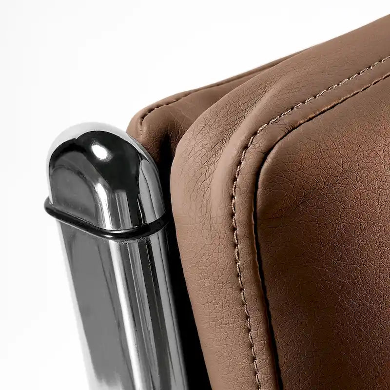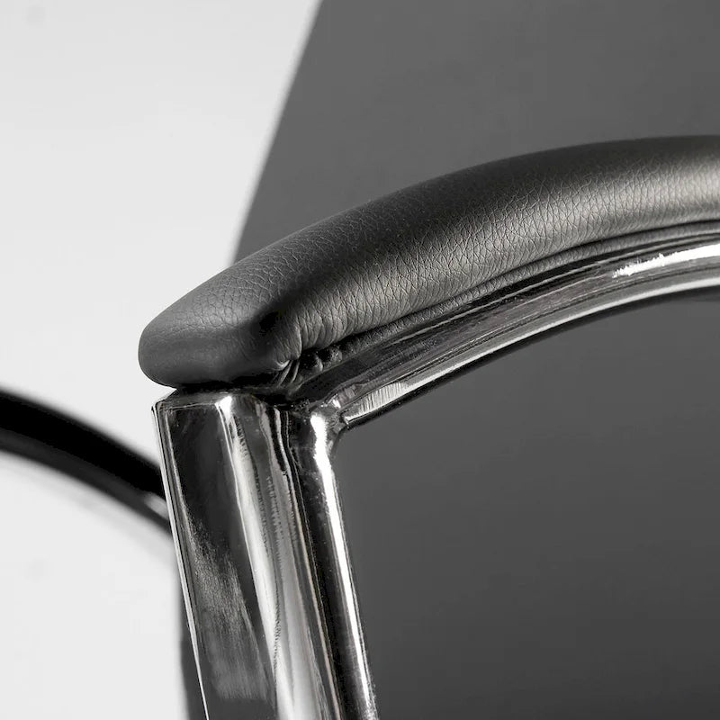 Upgrade your workspace with this Jamestown swiveling executive chair from Bush Business Furniture. Engineered with a curving metal frame and simple, sectioned leather upholstery, this chair adds a contemporary elegance to your office. The ergonomic padded backrest and seat keep you comfortable during long hours behind the computer, and the curving arms offer extra support when you need it. Move easily around your space on the five-star wheeled base, and use the lever to adjust the height to match your desk.