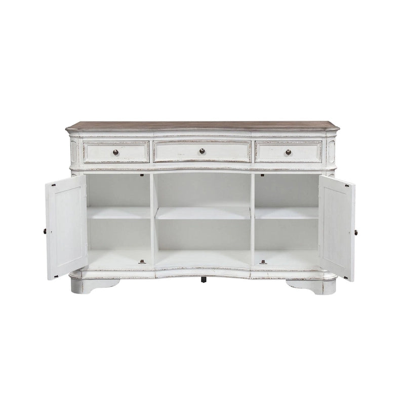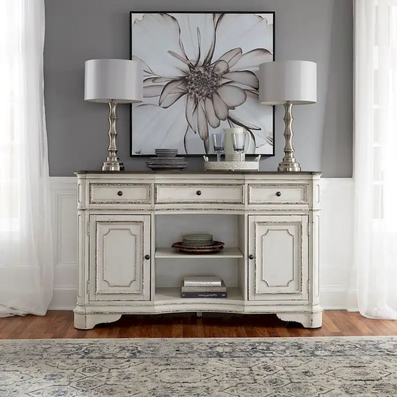 Indulge in the perfect blend of European design with the Magnolia Manor server. Crafted of poplar solids with white oak and birch veneers, this piece features fully stained full extension drawers with felt lining for easy access to storage, a centered concave top drawer flanked by two storage drawers and doors, a convenient center shelf for added storage, and is accented by antique pewter knob hardware. Storage abounds with an adjustable shelf located behind the two doors, the center open area with an adjustable shelf, and the wood framed drawers. The attention to detail is impeccable with the weathered brown finish accented by whitewash, the canted corners, rounded pilasters, and bead molding anchored down by the bracket feet. Warm antique finishes and artistic distressing along with grand scale a group to be passed to generations.