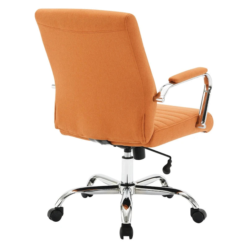 With the perfect blend of style, functionality, and crisp, tailored sophistication, our mid-back, office chair will add comfort, and beauty and provide the perfect addition to your office.Featuringa well-suited horizontal channel tufted detail throughout the seat and back, this chair will add a traditional elegance to any workspace. With 360? swivel, you can effortlessly move around your desk, reaching everything you need with ease. Height adjustable seat ensures optimal positioning for your body. The adjustable tilt tension allows you to customize the seat angle to suit your preferences, promoting a more relaxed and productive work environment.Crafted with a beautiful metal 5 star-base, in chrome finish, this chair not only looks great but also offers long-lasting durability. The dual carpet casters, padded armrests and soft fabric covering add a stylish upgrade, making this chair a statement piece in your office.