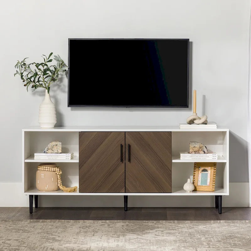 Showcase your eye for modern design with this contemporary TV console. The faux bookmatch doors and two-tone finish offer an upscale look to enhance your living room, home office, or dining area. Three adjustable shelves provide simple organization for movies, board games, and other entertainment essentials. Tuck clutter out of sight behind the two doors. The warp-resistant MDF build and sturdy, metal legs provide a durable frame that lasts. This piece arrives ready-to-assemble.