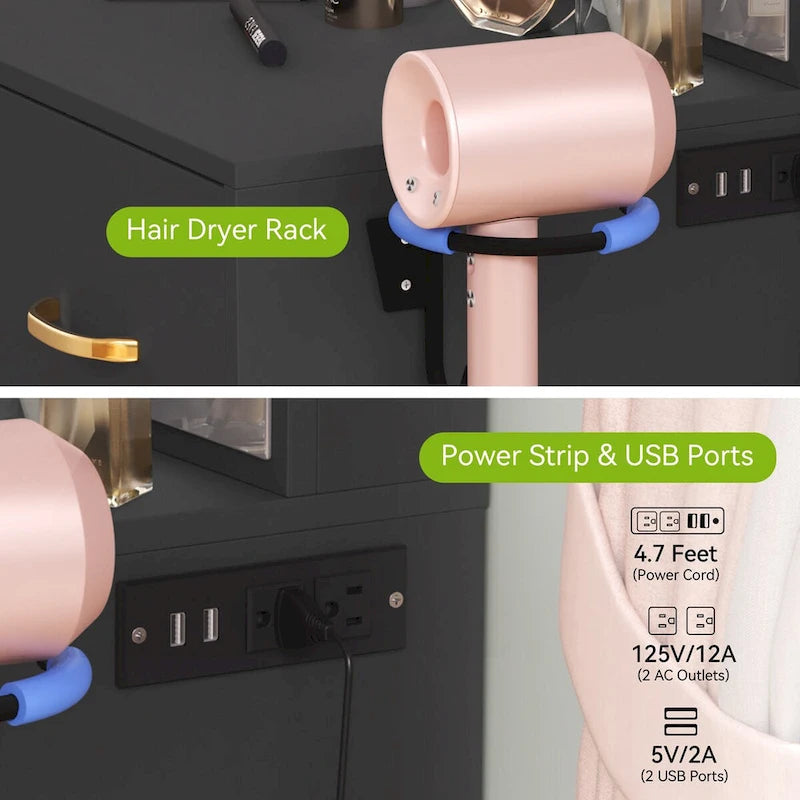 - Built-in charging station and hair dryer rack: A multi-functional makeup desk that combines 2 standard plug sockets, 2 USB ports, and 1 hair dryer rack so your hair dryer, mobile phone, and curling iron can be within arms reach; Glam makeup vanity for dressing room, bedroom, salon, or live broadcast
