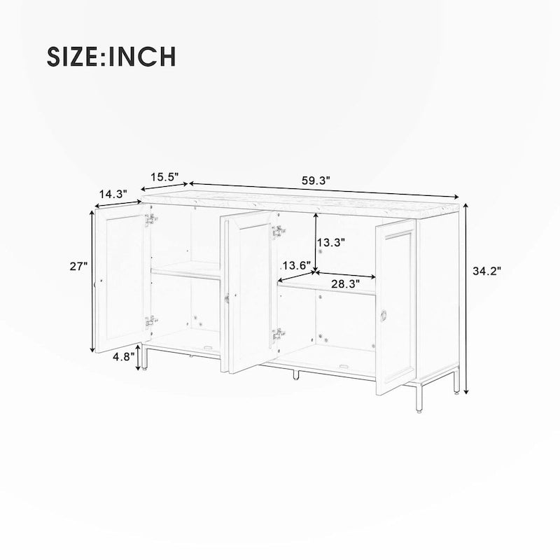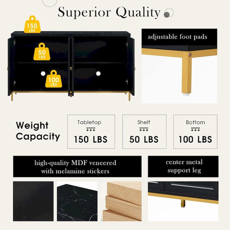 Modern EleganceImmerse your living space in the epitome of modern luxury with our four-door sideboard. Crafted from durable MDF, its sleek design is adorned with faux marble stickers on the top panel and solid-color melamine stickers on the body, exuding sophistication and refinement that elevate any contemporary decor. It's available in two colors: black and light grey. No matter which color you choose, it will work well with your modern home decor style.Versatile UseThis sideboard can make you experience unparalleled organization with ample storage space inside. The adjustable shelf heights cater to individual needs, offering customizable storage solutions to maximize space efficiency. Moreover, the thoughtful design of wire holes in the back panels and shelves ensures effortless organization of cables and accessories, enhancing the versatility of the sideboard for modern living.Product FeaturesModern Elegance: Immerse your living space in the epitome of modern luxury with our four-door sideboard. Crafted from durable MDF, its sleek design is adorned with faux marble stickers on the top panel and solid-color melamine stickers on the body, exuding sophistication and refinement that elevate any contemporary decor. It's available in two colors: black and light grey. No matter which color you choose, it will work well with your modern home decor style.Meticulous Details: The epitome of contemporary elegance, our four-door sideboard boasts meticulous details that elevate its allure. Each cabinet door features intricately carved grooves, adding depth and texture to the sleek design. The circular metal handles and metal-painted support legs not only enhance its modern aesthetic but also ensure unparalleled durability and stability, making it a statement piece that seamlessly blends style and functionality in any living space.Superior Quality: The sideboard is made of high-quality MDF veneered with melamine stickers. Engineered for longevity, the center metal support legs reinforce the overall structure, ensuring stability and durability. Adjustable foot pads provide additional stability on any surface, while allowing for effortless leveling to accommodate uneven floors. The tabletop, shelves and bottom have a weight capacity of 150 lbs, 50 lbs and 100 lbs respectively.Versatile Use: This sideboard can make you experience unparalleled organization with ample storage space inside. The adjustable shelf heights cater to individual needs, offering customizable storage solutions to maximize space efficiency. Moreover, the thoughtful design of wire holes in the back panels and shelves ensures effortless organization of cables and accessories, enhancing the versatility of the sideboard for modern living.Full Assembly Required: This product comes with detailed instructions, and it can be installed step by step following the instructions, which can help you complete the assembly as soon as possible.FeaturesMaterial:MDF + Melamine StickersWeight Capacity:Tabletop: 150 LBS Shelf: 50 LBS Bottom: 100 LBSDoor Dimension:27L x 14.3WFinish:Melamine StickersFinish Back:YesPackage Number:2Assembly Required:1 hAdditional Tools Required:All Tools Included