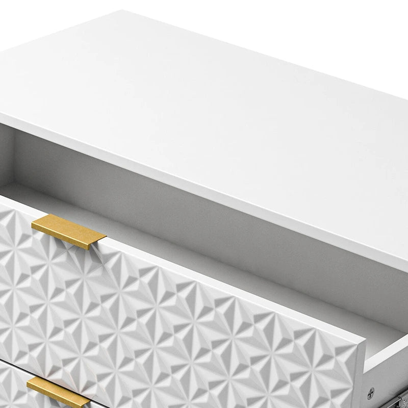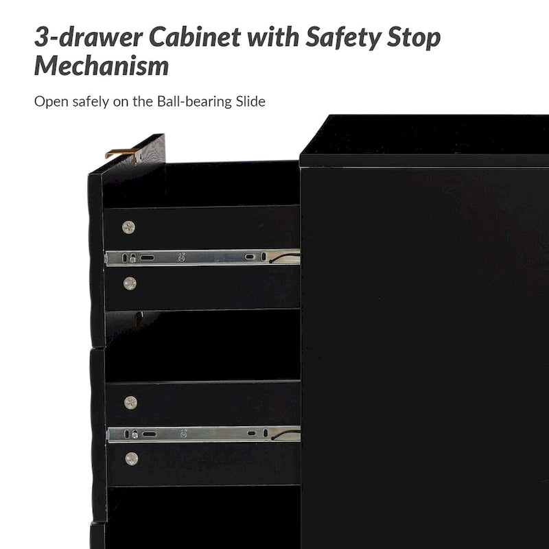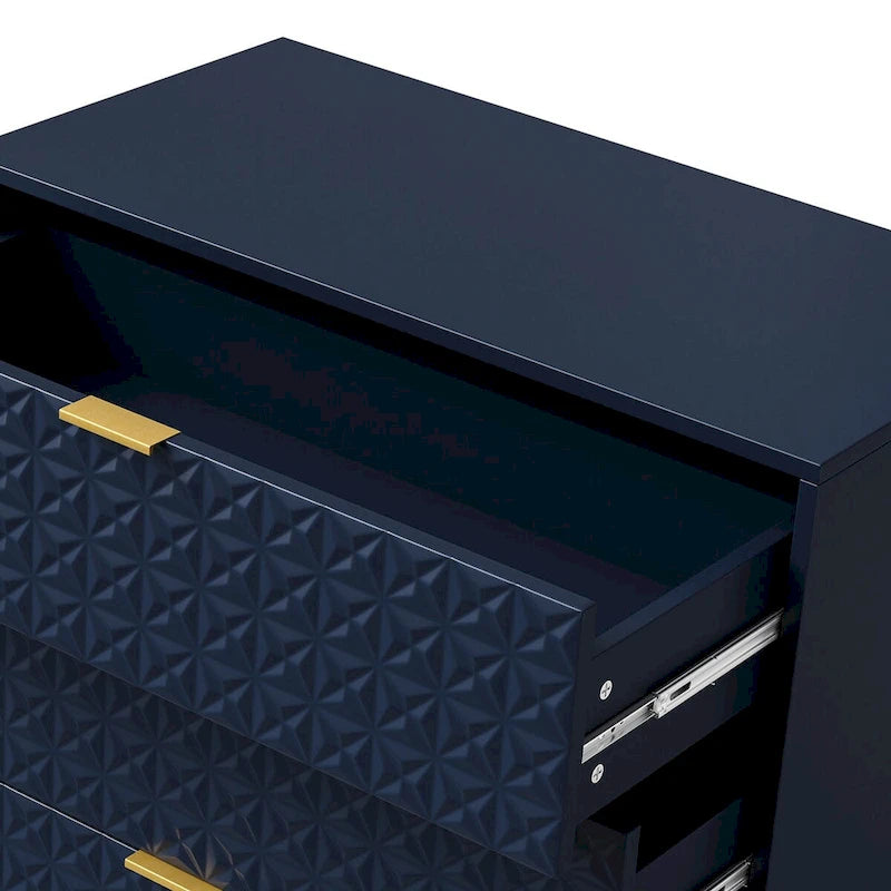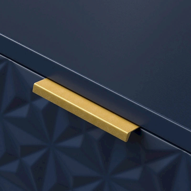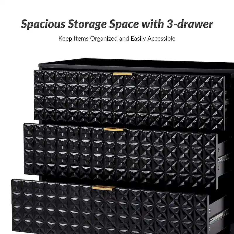 Helping you easily tuck away and organize bedside essentials, this mid-century storage cabinet is designed for the hallway, living room or storage space. Featuring attractive embossed patterns, 3 drawers equipped with ball-bearing slides and a safety stop mechanism that allows you to pull them out with ease. Supported by a metal base, the modern storage cabinet uses golden metal legs, which match the golden handles to create a charming appearance. Except for a clean-lined silhouette, it features 3 drawers to access your items with ease and works with other collection pieces to build out your dream home. Behind each drawer, you'll discover ample space for bonus storage. Waterproof, scratch-resistant, and stain-repellent, this wood cabinet is inclined to recall the pared-down designs of the mid-century and is exquisitely designed for your living spaces.