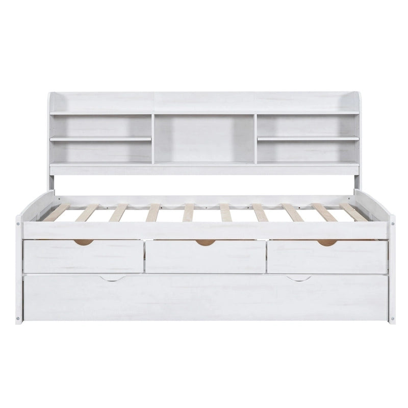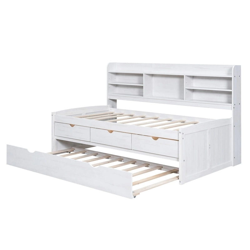 White Washed Twin Size Wooden Captain Bed with Bookshelves, 3 Drawers, Trundle
